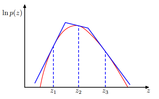 一般的拒绝采样直接从一个单一的基准分布上采样,很多时候基准分布并不能很好地贴近目标分布,可以使用分段的方法。基准分布分成许多小段的指数分布。