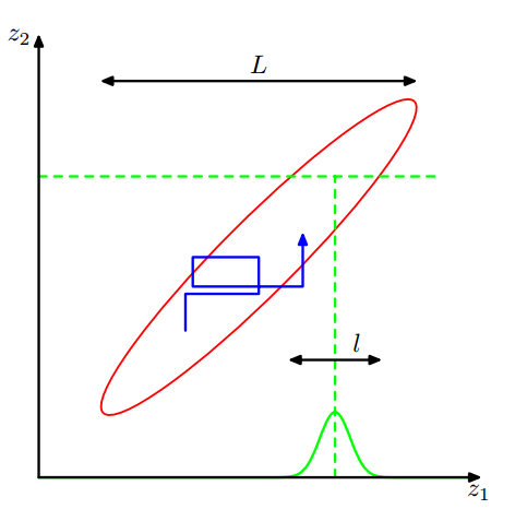 如果考虑转移概率为高斯分布的形式,那么方差大小的选择影响着采样效率。方差太大那么在状态空间转移就快,但是拒绝率也高,导致采样效率并不一定高;方差太小那么在状态空间转移就慢,采样效率一样不高。