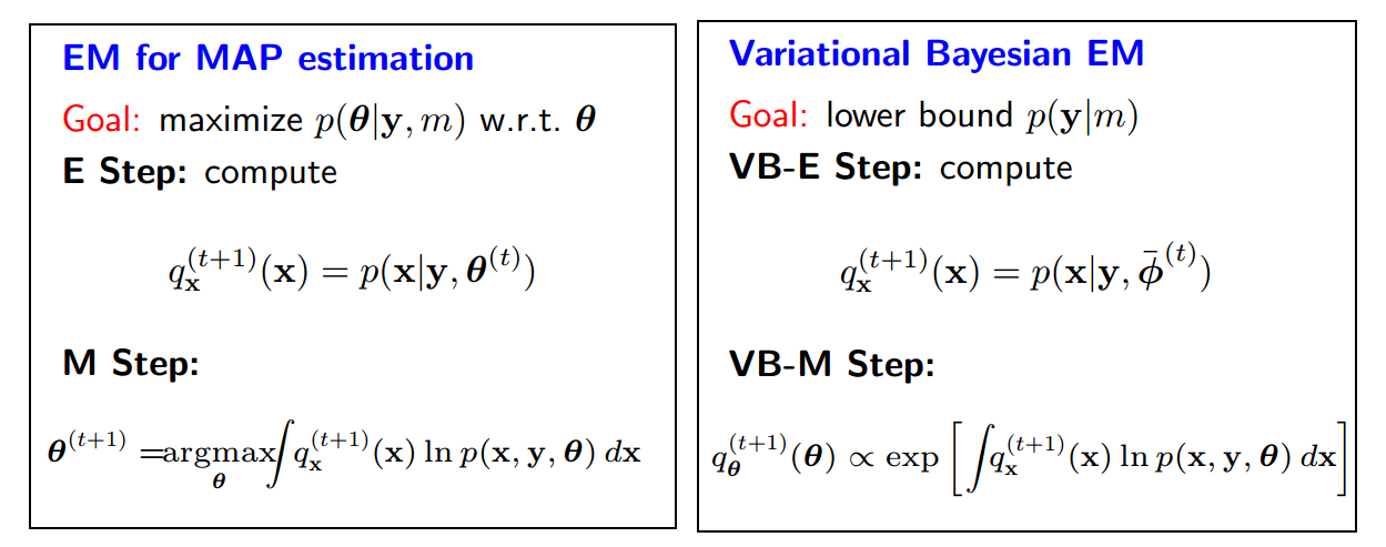 VB可以视为EM算法的扩展。EM对参数后验的估计是点估计,对隐藏变量才是真实的后验估计。VBEM则同时对参数与隐藏变量的真实后验进行估计。